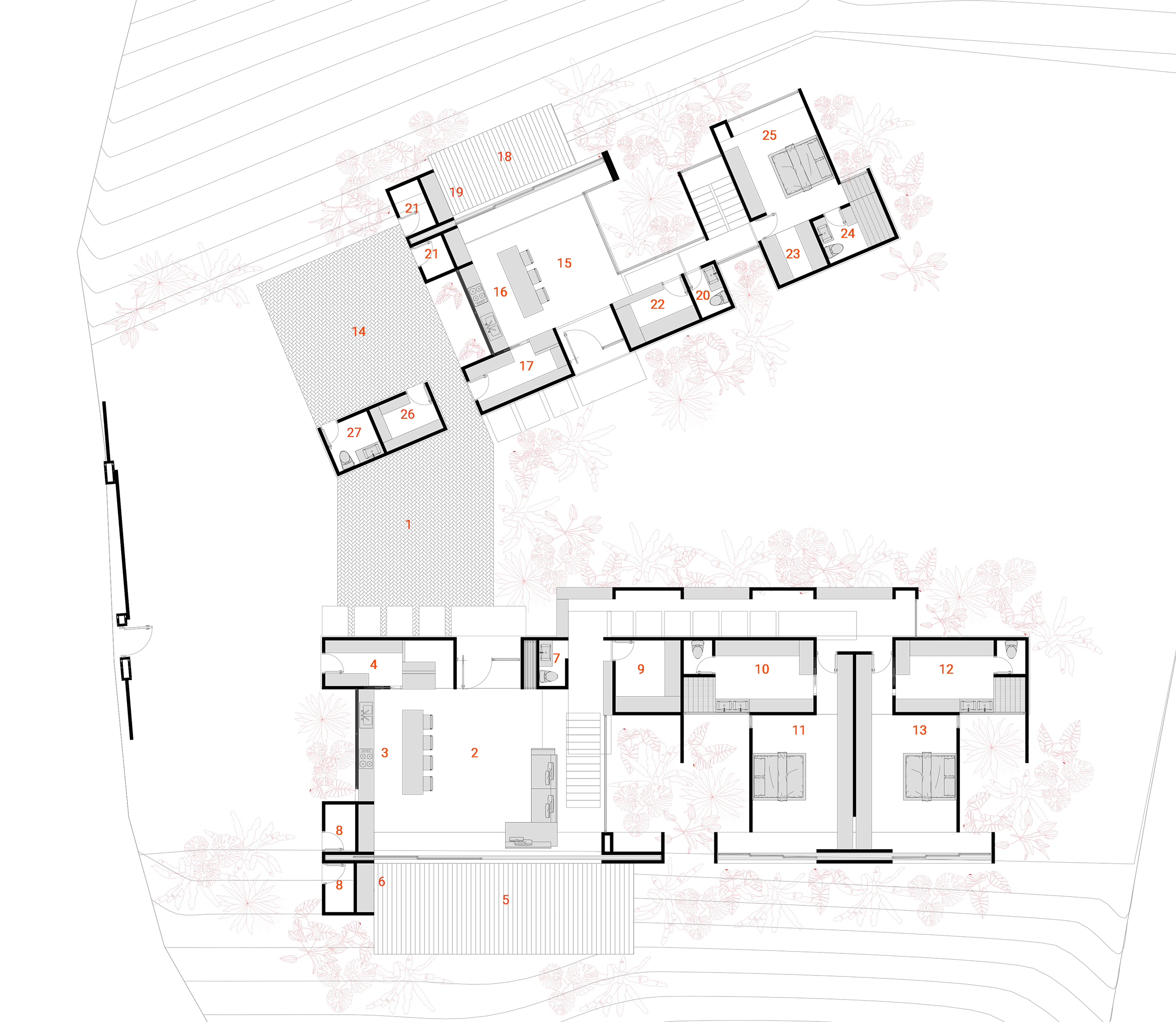 La planta y los cortes estructuran la lógica del proyecto: recorridos fluidos, proporciones cuidadas y relaciones precisas entre interior, exterior y paisaje. La estructura no solo sostiene: ordena y define el carácter del espacio..